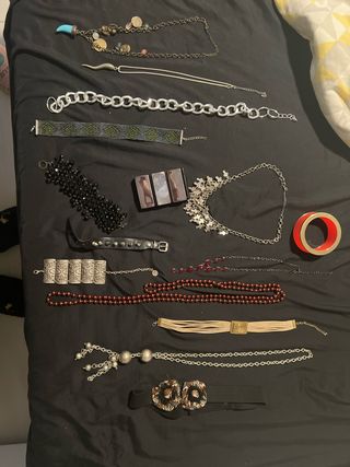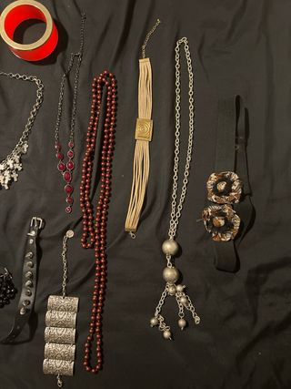 Conjunto de accesorios de estilo retro. - Collar con colgante turquesa y monedas. - Collar largo con detalle de cuerno. - Pulsera de eslabones grandes. - Pulsera tejida con cuentas verdes. - Pulsera de cuentas negras. - Collar con diseño floral plateado. - Pulsera de cuero con tachuelas. - Brazalete plateado con grabados. - Collar de cuentas granates. - Collar de tiras beige con detalle dorado. - Collar largo con cuentas plateadas. - Cinturón negro con hebillas decorativas. 6€ sueltos