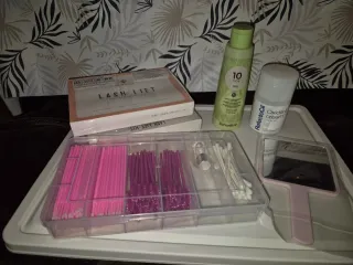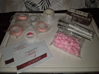 Kit completo para realizar lifting de pestañas. - Incluye aplicadores rosas y morados. - Contiene espejo de mano. - Incluye productos RefectoCil y Schwarzkopf. - Incluye bastoncillos y otros accesorios. TODO SIN USAR Se puede juntar con el pack de manicura