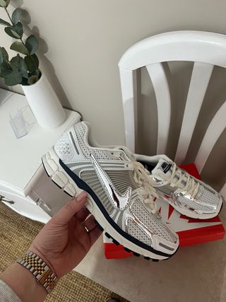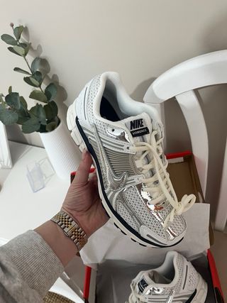 Zapatillas Nike Zoom Vomero 5 en color plata y blanco. Un diseño moderno y cómodo. - Parte superior de malla transpirable. - Detalles plateados reflectantes. - Suela con amortiguación Zoom Air.