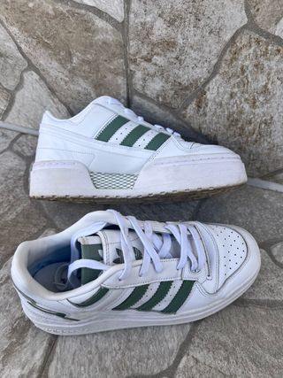 Zapatillas Adidas Forum Bold en color blanco con detalles en verde. Usadas menos de 10 veces, las vendo por problemas personales en los pies.