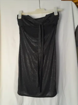 Elegante vestido negro sin tirantes, perfecto para una ocasión especial. Presenta un detalle de pedrería en el escote y un favorecedor fruncido en la parte delantera. - Escote adornado con pedrería. - Diseño fruncido. - Tejido con brillo sutil. C11