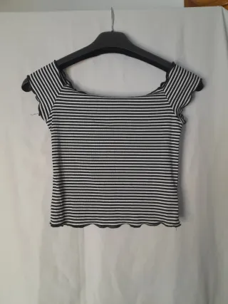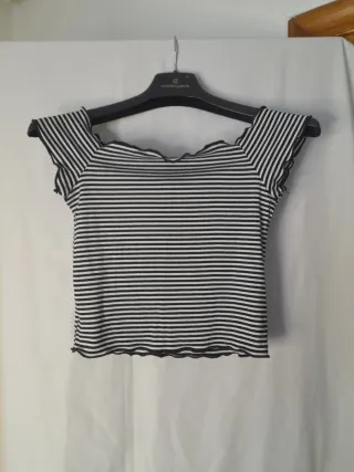 Camiseta de rayas blancas y negras con un diseño moderno. - Tirantes anchos con volantes. - Cuello elástico con volante. - Bajo con volante. C11