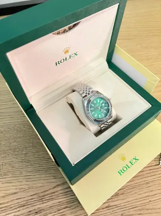 Elegante reloj de pulsera con detalles en oro y esfera verde. - Bisel estriado. - Brazalete Jubilee de acero y oro. - Marcadores de hora en números romanos. Entrega en ciempozeulos madrid