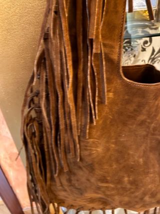 Bolso de piel con un diseño bohemio y moderno, adornado con flecos. - Material: Piel - Color: Marrón - Detalle de flecos largos en todo el contorno. Nunca usado . Va forrado por dentro . Súper cómodo no pesa nada..