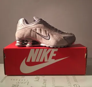 Zapatillas Nike Shox con un diseño moderno y llamativo. - Combinación de colores plata y blanco. - Detalle del icónico swoosh de Nike.
