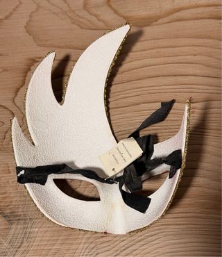Elegante máscara veneciana con un diseño llamativo. - Adornada con detalles dorados y purpurina. - Pequeñas flores blancas decoran la superficie. - Incluye cintas negras para sujetar.