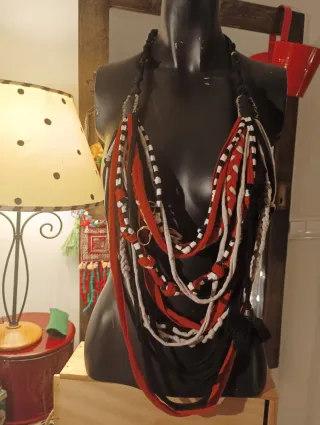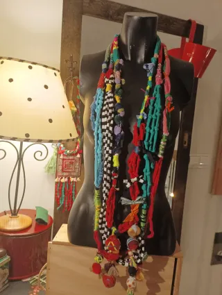 Collar artesanal con un diseño exclusivo único y llamativo, realizado en lana,tela y metal.Estilo Boho chic,queda muy bonito. Tengo más piezas exclusivas de collares,anillos,pulseras,gorros, calzado,ropa ,bolsos... en mis anuncios.