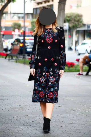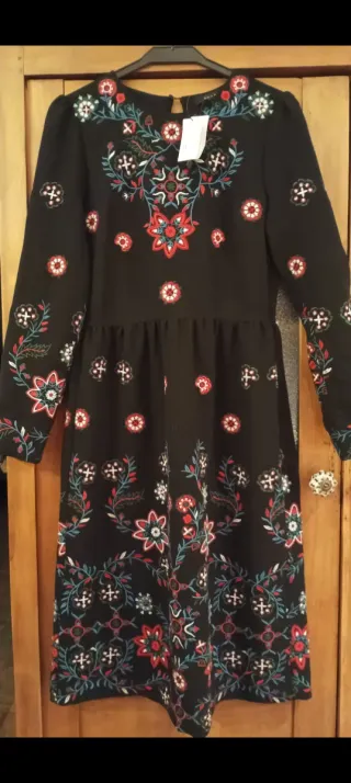 Vestido fondo negro y bordado talla M,LA IMAGEN DE LA MODELO ES DE PUBLICIDAD DE ZARA .Nuevo a ESTRENAR de ZARA para mujer o chica,precioso bordado multicolor. IDEAL PARA ESTAS FECHAS DE NAVIDAD.Cremallera lateral, cuello redondo, puño en manga. Tiene mucha caída por su bordado sobre una tela de Crepé negra. Muy elegante, queda superbonito puesto y muy favorecedor.MEDIDAS: 38 cintura X 40 de sisa a sisa (pecho) X 104 largo total.