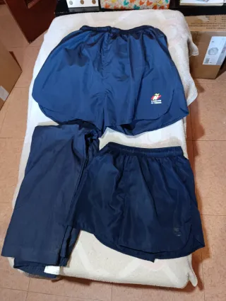 Pack de pantalones de deporte, talla S todos. El pack está compuesto de 2 pantalones cortos de deporte, uno de ellos a estrenar y el otro en buen estado. Y también se incluye el pantalón largo también en buen estado.