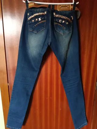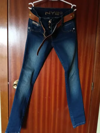 Vaquero colombiano de la marca NYE. Un básico para tu armario. - Diseño ajustado. - Cinturón de cuero marrón incluido. - Detalle de pedrería en los bolsillos delanteros.