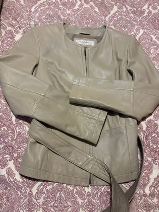 Chaqueta de cuero beige y dorada con cinturón