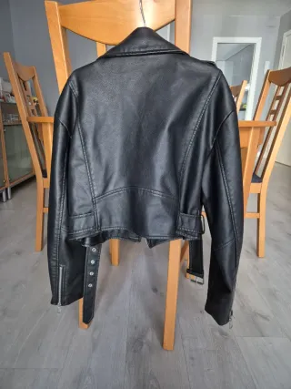 Chaqueta de piel sintética con un diseño moderno y atemporal. Cazadora de polipiel de buena calidad estilo oversize motera Sin estrenar idéntica a la de Zara - Corte tipo biker. - Cierre de cremallera. - Bolsillos con cremallera. - Cinturón ajustable en el bajo abrigo con solapas