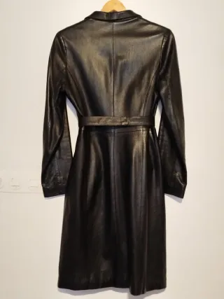 Elegante abrigo entallado para mujer. - Material: Cuero muy suave, de alta calidad. - Color: Negro - Diseño: Cinturón con hebilla en la cintura. - Cierre: Botones