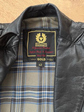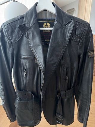 Chaqueta de cuero estilo motero de la marca Belstaff. - Diseño acolchado en hombros. - Cierre frontal con cremallera. - Cinturón ajustable a la cintura. - Múltiples bolsillos con cremallera y solapa.