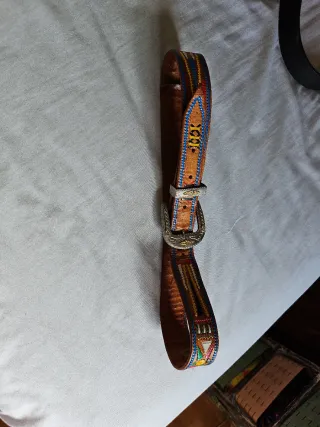 Cinturón de cuero con un diseño bordado y detalles coloridos. - Diseño con bordados. - Hebilla metálica.