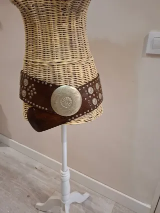 Cinturón de cuero con detalles metálicos y hebilla grande. - Material: Cuero - Color: Marrón y plateado - Diseño: Tachuelas y hebilla decorada