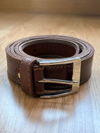 Cinturón de cuero natural con hebilla metálica. De 4 centímetros de ancho y 121 centímetros de largo. - Material: Cuero genuino. - Hebilla: Plateada. - Diseño: Clásico y versátil.