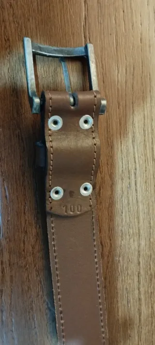 Elegante cinturón de cuero con un diseño clásico y una hebilla metálica. Talla 42/44 - Material: Cuero - Color de la hebilla: Dorado - Color del cinturón: Marrón