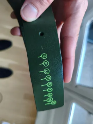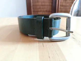 Cinturón de cuero en color verde. Un accesorio con un diseño moderno y versátil. Talla S - Hebilla metálica plateada. - Detalle de costuras reforzadas.