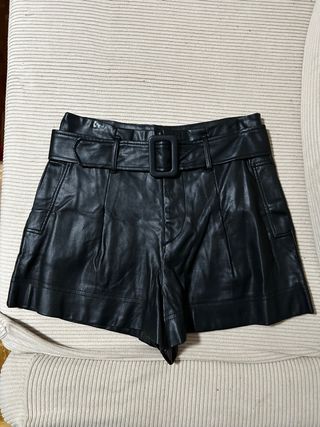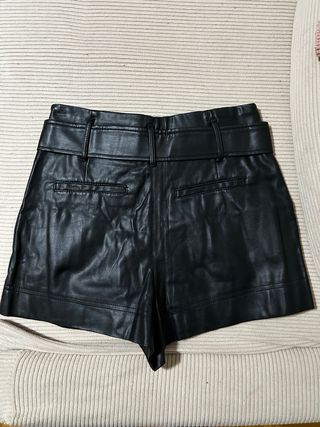 Shorts de cuero sintético negro con cinturón. - Cinturón negro con hebilla cuadrada. - Diseño de cintura alta. - Bolsillos laterales. - Costuras decorativas.