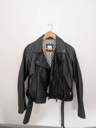 Chaqueta de piel sintética con un diseño moderno y atemporal. Cazadora de polipiel de buena calidad estilo oversize motera Sin estrenar idéntica a la de Zara - Corte tipo biker. - Cierre de cremallera. - Bolsillos con cremallera. - Cinturón ajustable en el bajo abrigo con solapas