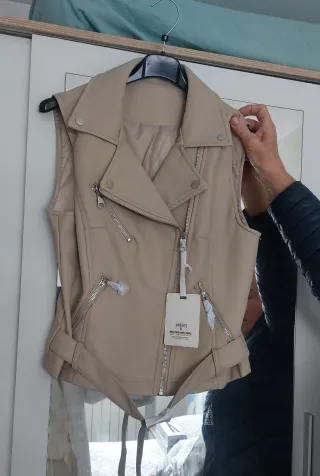 Chaleco estilo motero en color blanco roto, con detalles en cuero. - Diseño sin mangas. - Cremalleras plateadas. - Cinturón ajustable en la parte inferior. NO SE REBAJA PRECIO, EN MANO Y EN EFECTIVO SE PAGA