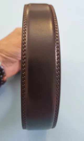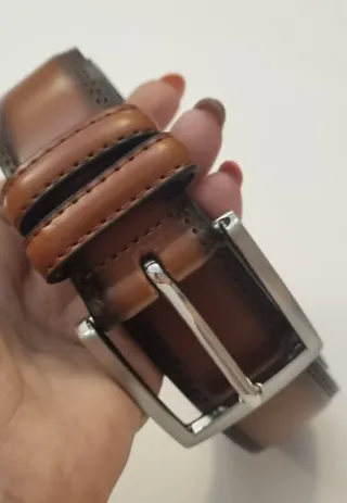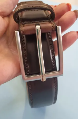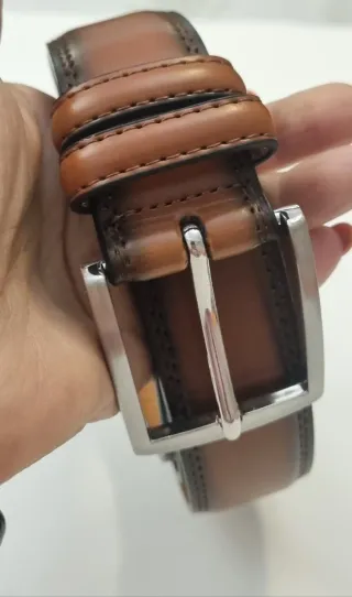 Elegante cinturón de cuero genuino de vaca para hombre. Un accesorio clásico y versátil. - Material: Cuero genuino de vaca. - Hebilla metálica plateada. Tengo talla 115 cm y talla 120 cm de largo de ancho mide 3,5 cm