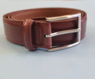 Cinturón de cuero marrón de la marca Coronel Tapioca. Largo 1.12 sin estirar. Estira asta 1.46 - Hebilla metálica plateada. - Correa de cuero con pespuntes blancos. - Correa interior de tejido trenzado en color burdeos.