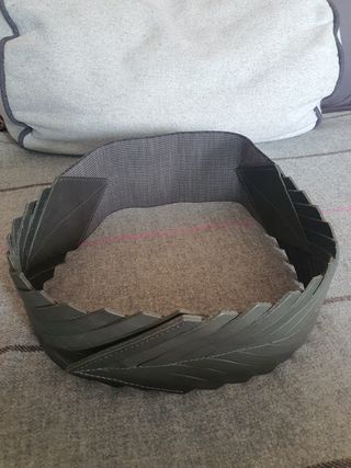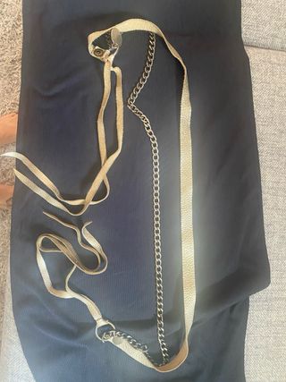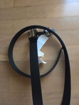 Cinturón negro con un diseño moderno y detalles metálicos. - Hebilla plateada. - Ojales metálicos a lo largo de la correa. - Correa de material resistente. - usado solo una vez - no tiene el cuero pelado ni con signos de desgaste