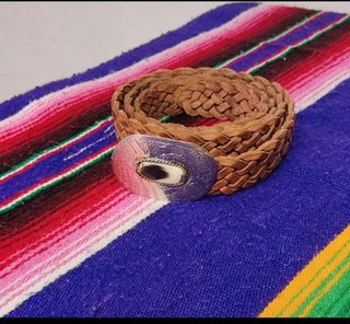 Cinturón tejido a mano con detalles únicos. 4 cm ancho x 100 cm largo. - Diseño artesanal. - Material de cuero. - Hebilla metálica.