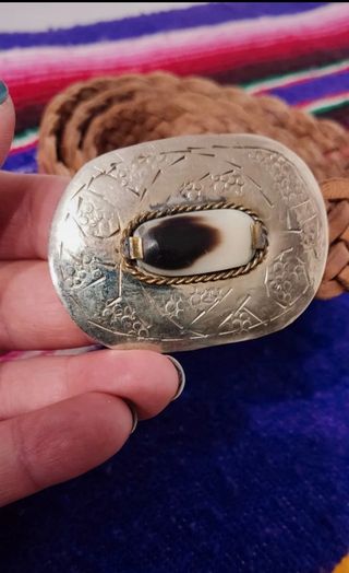 Cinturón de cuero y Hebilla piedra Cinturón de piel trenzada de 120 cm de largo x 2,5 cm de ancho. Precioso. Llega una hebilla frontal labrada y piedra central.