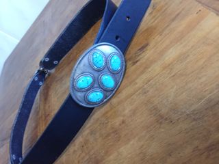 Cinturón con un diseño llamativo y elegante. - Hebilla ovalada de metal plateado. - Detalle de cinco piedras de color turquesa. - Correa de cuero negra.