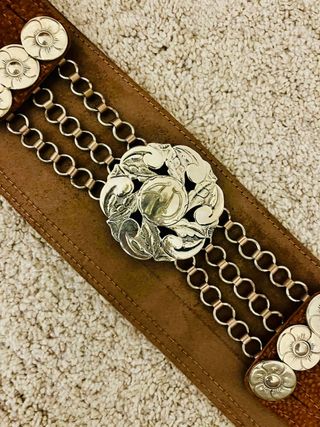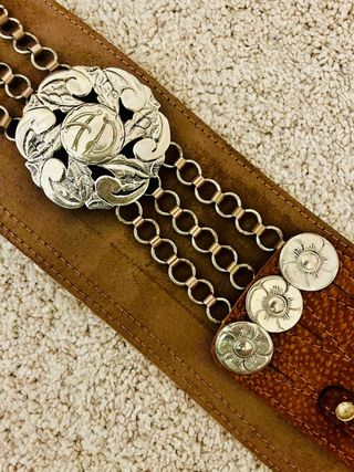Cinturón de estilo gaucho con detalles en plata y cuero. - Hebilla central con diseño floral y monograma. - Tres cadenas decorativas. - Adornos circulares en los extremos.
