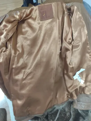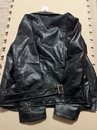 Chaqueta de cuero sintético con un diseño moderno y atrevido. Ideal para darle un toque rebelde a tu estilo. - Cierre principal de cremallera. - Múltiples bolsillos con cremallera. - Cinturón con hebilla en la parte inferior. - Puños con cremallera. talla L (estrecha) Podría ser más M aunque ponga eso en la etiqueta.