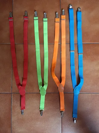 Lote de tirantes para niños en varios colores vibrantes. Perfectos para complementar cualquier atuendo. - Incluye tirantes en rojo, verde, naranja y azul. - Cuentan con pinzas metálicas para sujetar. - Detalle de cuero en la unión central.