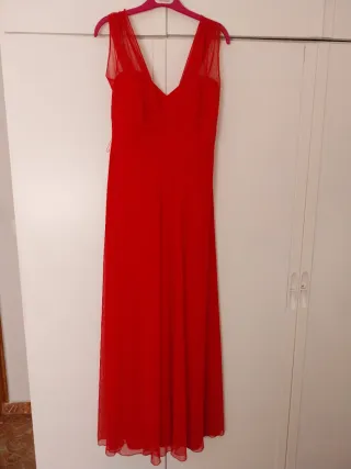 Elegante vestido rojo, ideal para eventos especiales. Su diseño es favorecedor y cómodo, apto para embarazadas por el corte que tiene bajo el pecho. - Corte fluido. - Escote en V. - Tejido ligero. - Falda y tirantes en tul. - Tiene hebilla de hilo por si se quiere poner cinturón. - Espalda con goma para perfecto ajuste. - La parte del pecho tiene cuerpo. Lo usé estando embarazada de 6 meses. Normalmente uso talla M/38. Usado una única vez.