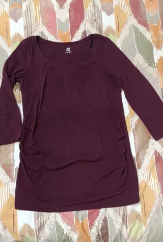 Camiseta de manga larga / tres cuartos para maternidad, de embarazo / premamá. Diseño cómodo y favorecedor. Color vino / burdeos. Marca H&M talla S. - Fruncido lateral para adaptarse a la figura. - Tejido suave y elástico. Tengo más ropa premamá en el perfil, camisetas leggins y pantalones. También cinturones para el coche. Hago packs personalizados