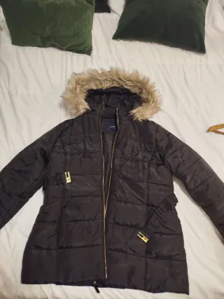 Abrigo acolchado con capucha de pelo sintético. - Cierre de cremallera dorada. - Cinturón ajustable con hebilla dorada. Puesto solo un invierno durante un embarazo. Luego se me quedó grande