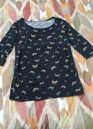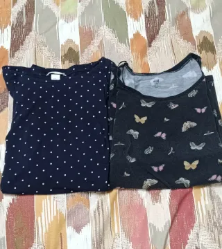 Camisetas premamá / embarazo / maternidad talla M marca HyM. Son de manga 3 cuartos. Muy cómodas una azul marino con lunares blancos y otra gris con mariposas. Tengo más ropa de embarazo en el perfil camisetas, pantalones y leggins. También cinturones de seguridad de embarazo para el coche. Hago packs personalizados