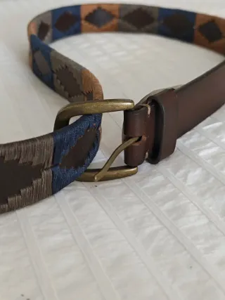 Cinturón de hombre con un diseño tejido y detalles en piel. Álvaro moreno. - Diseño de rombos en tonos azules y marrones. - Combina tejido y piel. - Hebilla metálica.