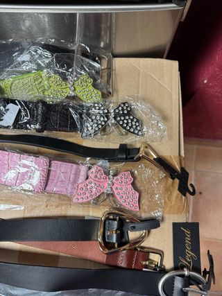 Conjunto de cinturones de mujer con diferentes diseños y hebillas. Precio 2 a 4 euros - Cinturón negro con hebilla plateada. - Cinturón rosa con textura de cocodrilo y mariposa brillante. - Cinturón negro con mariposa brillante. - Cinturón verde con mariposa brillante. - Cinturón estampado con estrellas y hebilla plateada. - Cinturón marrón con hebilla dorada.