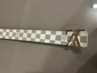 Cinturón Louis Vuitton con estampado Damier. - Hebilla dorada con logo. - Diseño a cuadros blanco y gris.