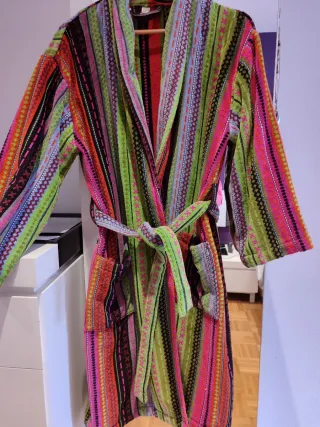 Albornoz de hombre con un diseño vibrante y llamativo. Perfecto para estar cómodo en casa. - Estampado de rayas verticales con múltiples colores. - Cinturón para ajustar a la cintura. - Dos bolsillos frontales.