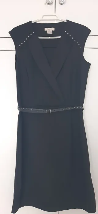 Elegante vestido negro con detalles de tachuelas en los hombros y cinturón a juego. - Diseño cruzado. - Tachuelas plateadas. - Cinturón fino con hebilla.