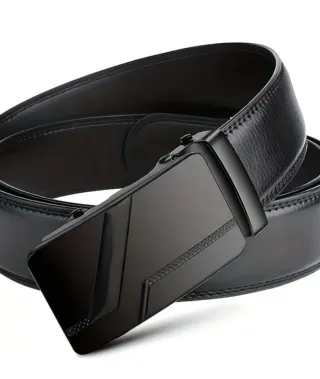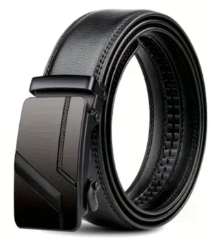 Elegante cinturón de hombre con un diseño moderno y sofisticado. - Hebilla metálica de color negro con detalles grabados. - Correa de cuero sintético. - Estilo versátil para cualquier ocasión.