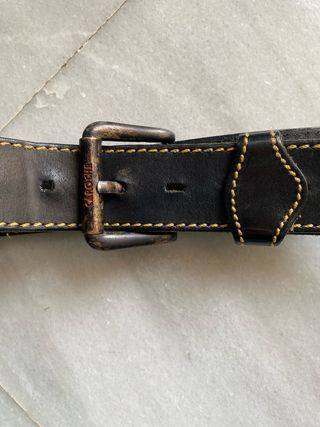 Cinturon negro de cuero homrbe Di Prego para vestir formal , tamaño de 1 metro exacto. Se le ha arreglado parte de la cabeza con tornillos nuevos. Hecho en España