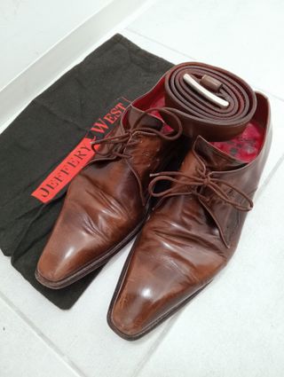 Conjunto de zapatos y cinturón de la marca Jeffrey West. - Zapatos de cordones. - Cinturón de cuero con hebilla metálica. - Fabricación Goodyear welted.
