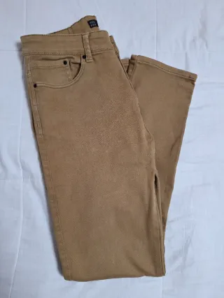 Pantalones beige para hombre de la marca Bershka. - Talla 38 - Corte skinny - Cintura con trabillas para cinturón. - Bolsillos delanteros. - Cierre de cremallera y botón. Tiene un pequeñito descosido, como se ve en la última foto.
