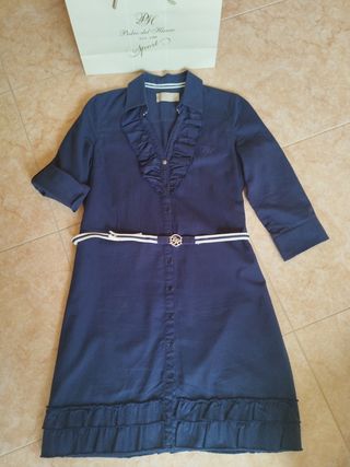 Talla L .Vestido de Pedro del Hierro azul marino con cuello de pico con volantes, manga francesa y se puede hacer más corta con un botón y trabilla que lleva. En el bajo lleva dos volantes de adorno. Se cierra con botones y lleva un cinturón con el logotipo de la marca. Medidas: largo desde el hombro 92cm, ancho de sisa a sisa 51cm, largo de la manga desde el hombro 45cm. Precio no negociable