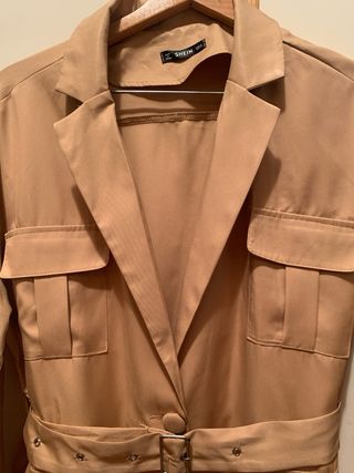 Chaqueta estilo sahariana en color camel. Diseño elegante y versátil. - Cuello solapa. - Cinturón con hebilla. - Bolsillos frontales con solapa. - Hombros caídos - Axila 60 cm -Largo 71 cm